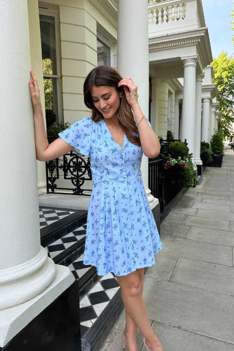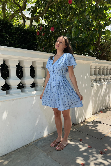 Floral summer dress curated with Vantage Atelier bespoke fabric, button-up front with back-tie.