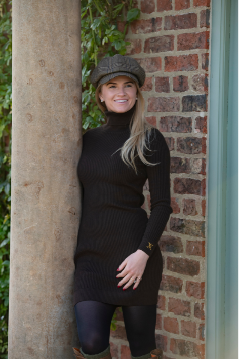 Rib-knit roll neck jumper dress, slim fitting with VA logo detail on the left cuff in gold.